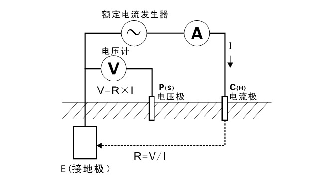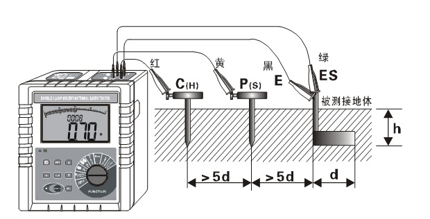 如圖所示:從被測(cè)物體起,分別將P(H)、C(H)輔助接地棒呈一條直線深埋入大地,將接地測(cè)試線(黑、綠、黃、紅)從儀表的E、ES、P(S)、C(H)接口對(duì)應(yīng)連接到被測(cè)接地極E、輔助電壓極P(S)、輔助電流極C(H)上。