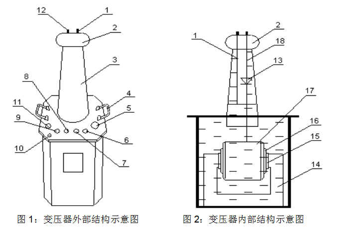 本系列產品鐵芯為單相芯式,采用優質冷軋取向硅鋼片疊制而成,緊固方式采用鋼材作夾件。高壓線圈為圓筒多層塔式,由優質聚酯漆包線及高耐壓值絕緣材料繞制而成。低壓線圈在外,儀表線圈為一獨立繞組,一般情況下為100V。殼體為八角形,10kVA以上的油浸式試驗變壓器裝有可移動的鐵輪。具有重量輕、體積小、移動方便、性能優越等特點。其外部結構圖見圖1,內部結構圖見圖2