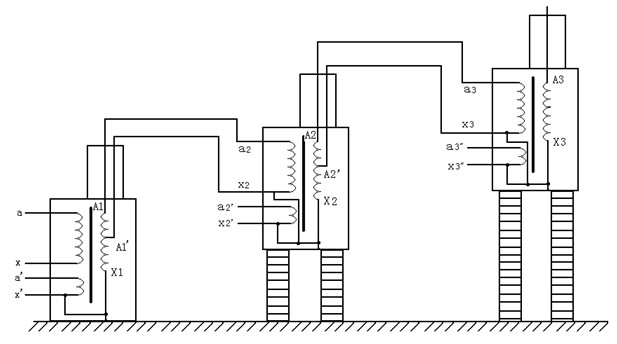 串級油浸式試驗變壓器有很大的優越性,三臺試驗變壓器串級連接可獲得更高的電壓,因為整個試驗裝置由幾臺單臺試驗變壓器組成,單臺試驗變壓器容量小、電壓低、重量輕,便于運輸和安裝。它既然可串接成高出幾倍的單臺試驗變壓器輸出電壓組合使用,又可分開成幾套單臺試驗變壓器單獨使用。整套裝置投資小,經濟實惠。圖5中,在第一級和第二級的每個單元試驗變壓器中都有一個勵磁繞組A1C1A2C2。在串級試驗變器基本原理圖中,低壓電源加在試驗變壓器I的初級繞組a1x1上,單臺試驗變壓的輸出電壓都是V。勵磁繞組A1C1給第二級試驗變壓器的初級繞組供電;第二級試驗變壓器的勵磁繞組A2C2給第三級試驗變壓器的初級繞組供電。第二級試驗變壓器和第三級試驗變壓器的箱體分別處在對地為1V2V的高電位上,所以箱體對地是絕緣的,試驗變壓器I的箱體是接地的。這樣第一級、第二級、第三試驗變壓器對地的額定輸出電壓分別為1V2V3V;其額定容量分別為3P2P1P