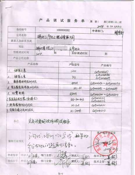 2014-11-04 湖北三寧化工股份有限公司進(jìn)行調(diào)試服務(wù),調(diào)試產(chǎn)品: