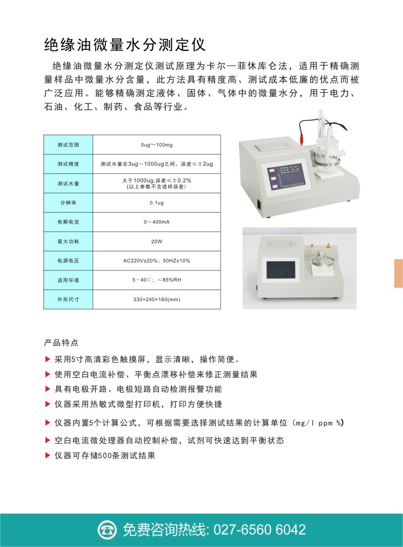 2. 測試精度:測試水量在3ug~1000ug之間,誤差≤±2ug