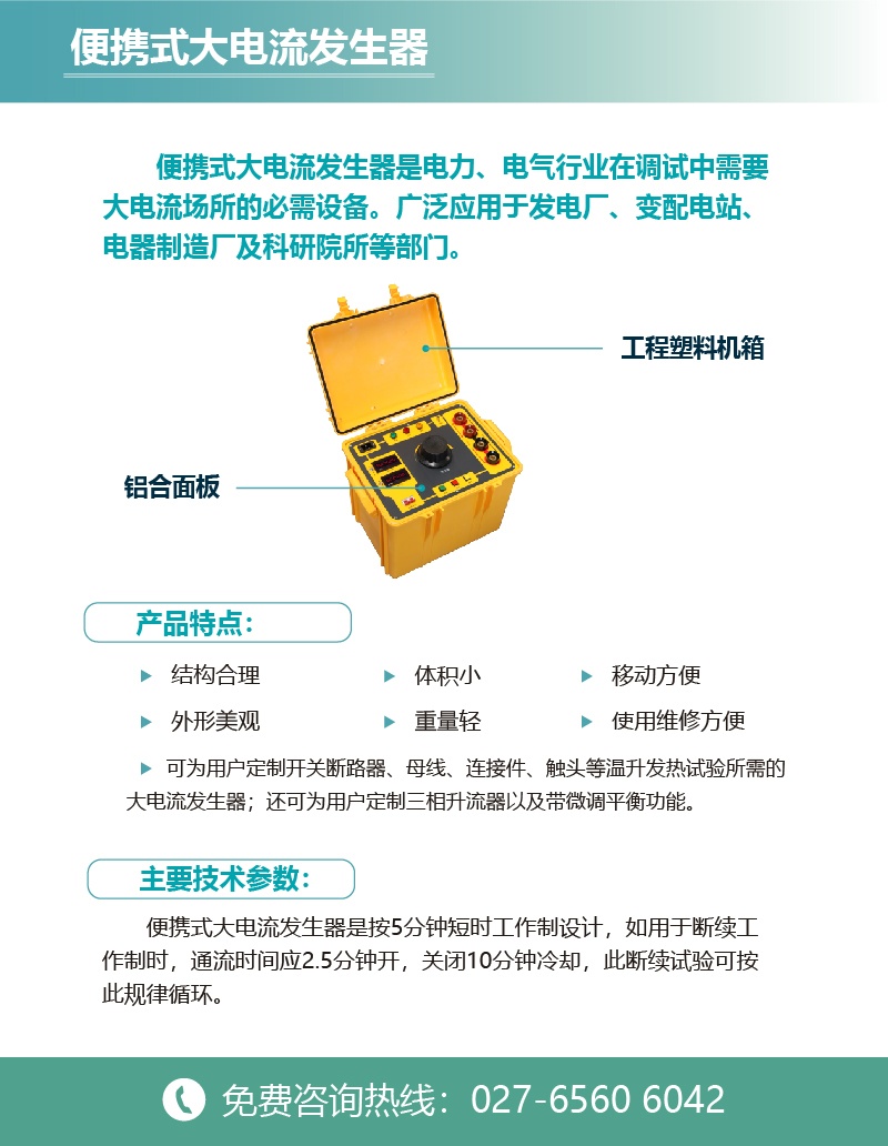 CYSL-BX-100便攜式大電流發生器是電力、電氣行業在調試中需要大電流場所的必需設備,應用于發電廠、變配電站、電器制造廠及科研院所等部門,屬于短時或斷續工作制,具有體積小、重量輕、使用維修方便等特點??蔀橛脩舳ㄖ崎_關斷路器、母線、連接件、觸頭等溫升發熱試驗所需的大電流發生器。還可為客戶定制三相升流器以及帶微調平衡功能。